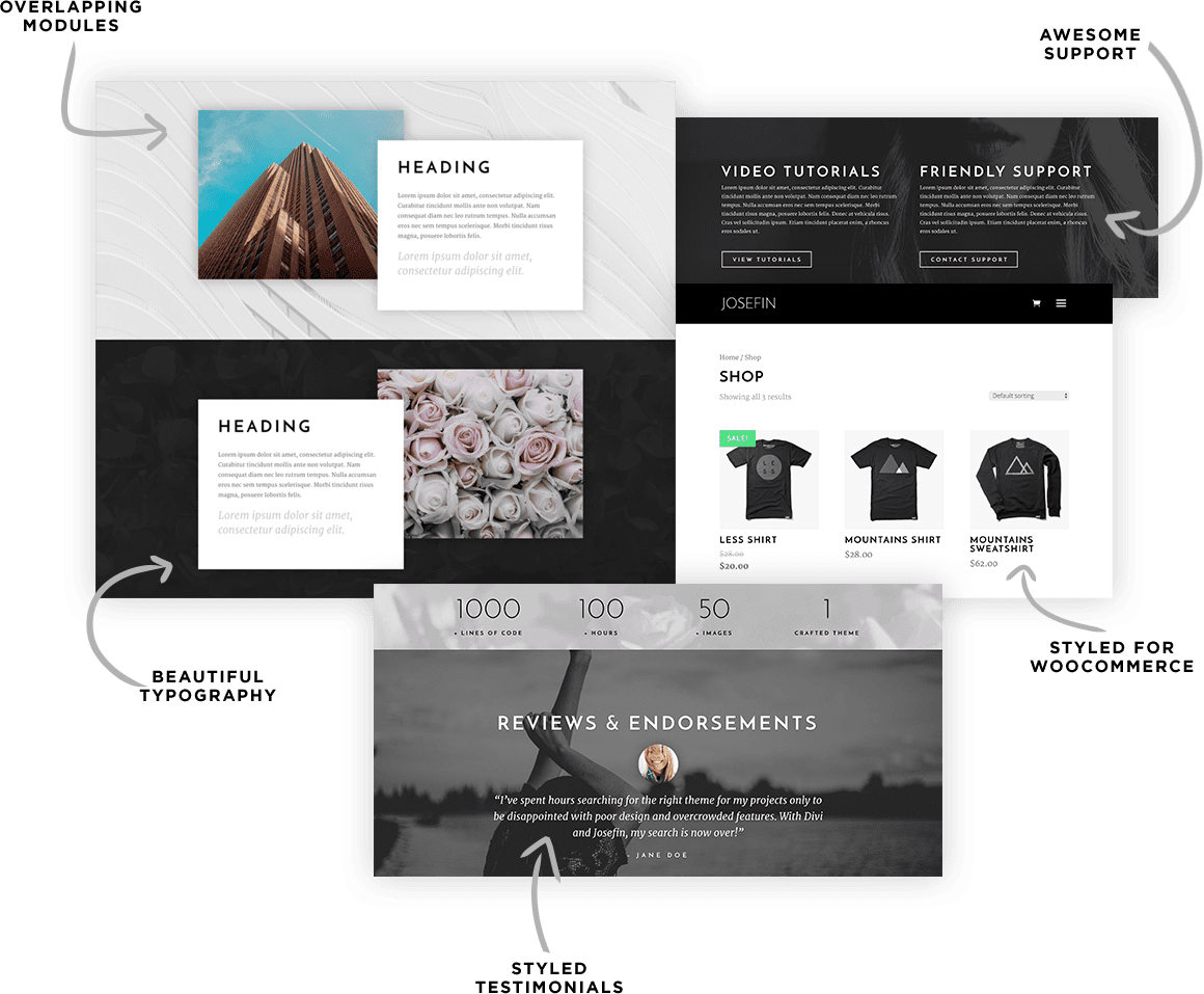Easily build a features grid with Josefin. We’ve created an instructional video with links to the CSS and a Divi Layout files. Import the layout into your site with a single click.